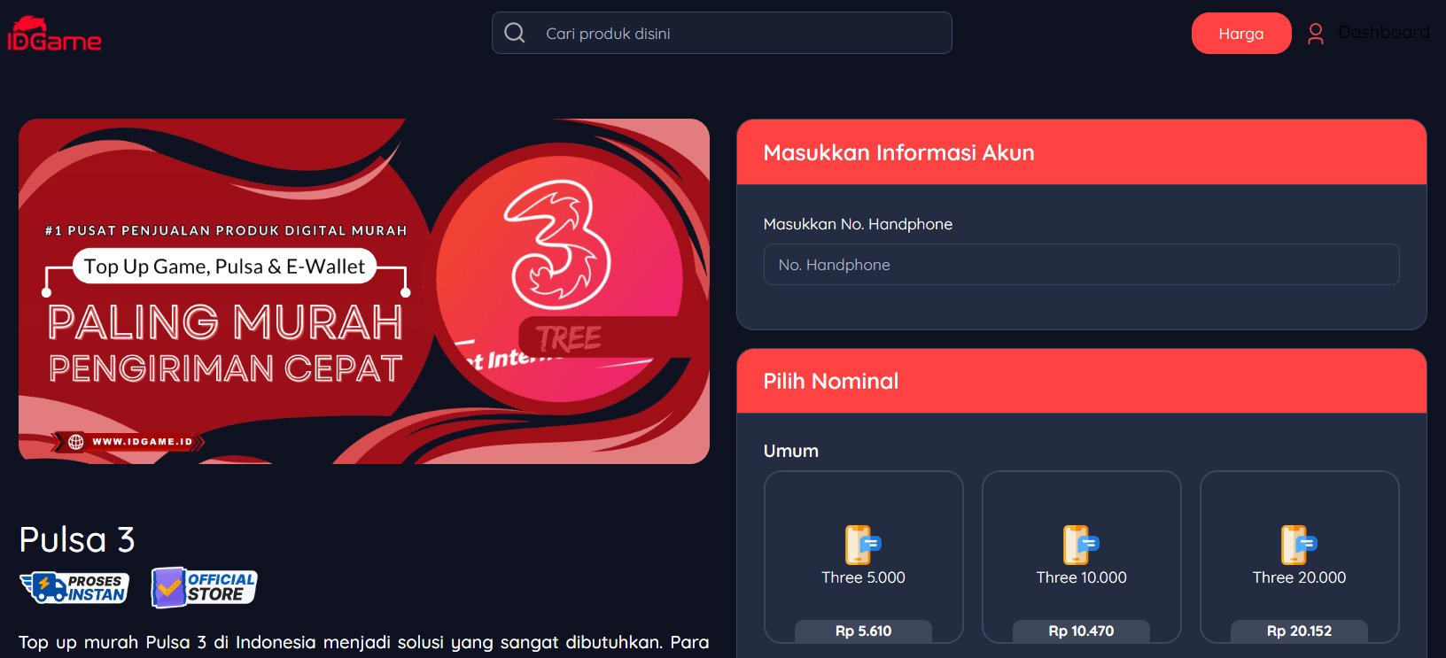 Cocok untuk anda yang ingin melakukan top up pulsa 3 di Idgame.id murah dan pastinya resmi langsung dari penyedia Tree. Sehingga ada tidak perlu kawatir kekurangan pulsa lagi untuk melakukan panggilan telepon, chat, sms, mms dll. IDGame menyediakan banyak varian pulsa yang bisa anda top up langsung, dan hitungan detik langsung masuk di saldo pulsa anda.